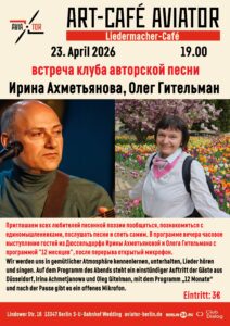 Alle Liebhaber von Gesang und Gitarre sind herzlich zum Liedermacher-Café eingeladen! Wir werden uns in gemütlicher Atmosphäre kennenlernen, unterhalten, Lieder hören und singen. Auf dem Programm des Abends steht ein einstündiger Auftritt der Gäste aus Düsseldorf, Irina Achmetjanowa und Oleg Gitelman, mit dem Programm „12 Monate“ und nach der Pause gibt es ein offenes Mikrofon.